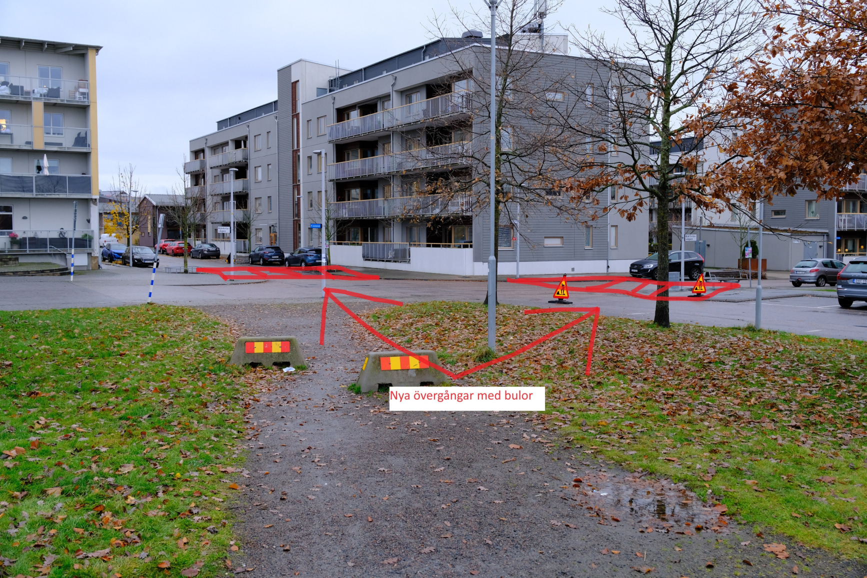 Där kommer att byggas 2st övergångsställen med vägbulor över Mor Eleonoras Väg, vid Pizzerian, samt över Björkrisvägen från skolans nordvästra hörn.